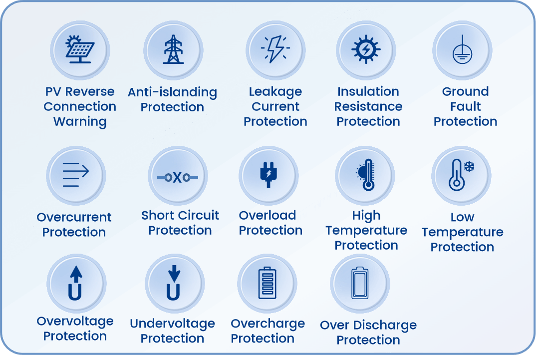 Protection Function | Over/Under Volt, Over/Under Freq, AC DC SQL, Arc - fault, Bus Over/Under Volt, Leakage Our, Input, PV Reverse Polarity, Grid Fault, PV Ray Alarm | ||||||