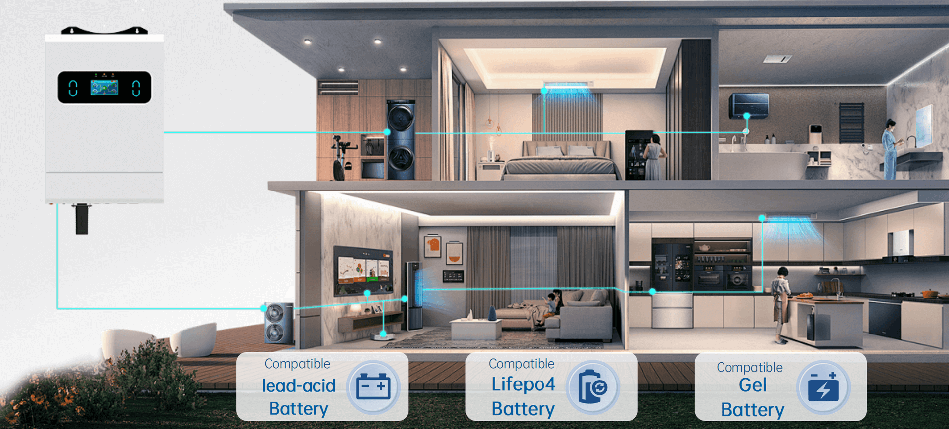 Compatible with lead-acid batteries, lithium batteries, and gel batteries; bypass output is available even when no battery is present, ensuring uninterrupted power to critical loads.